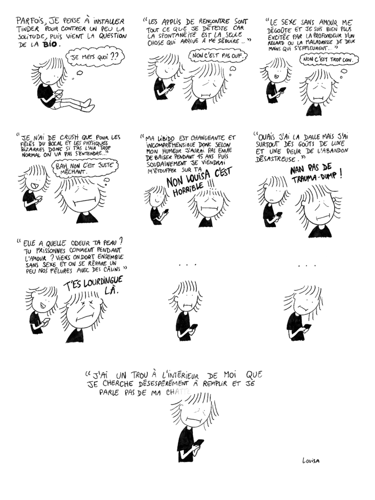Vous retrouverez dans ce livre une compilation de strips déjà publiés sur Instagram, ainsi que d'autres inédits. Ils parleront entre autres d'autisme, de peines de coeur, de dramas familiaux, de traumatismes transgénérationnels, de scoutisme, de l'absurdité des comportements humains et de zizi.