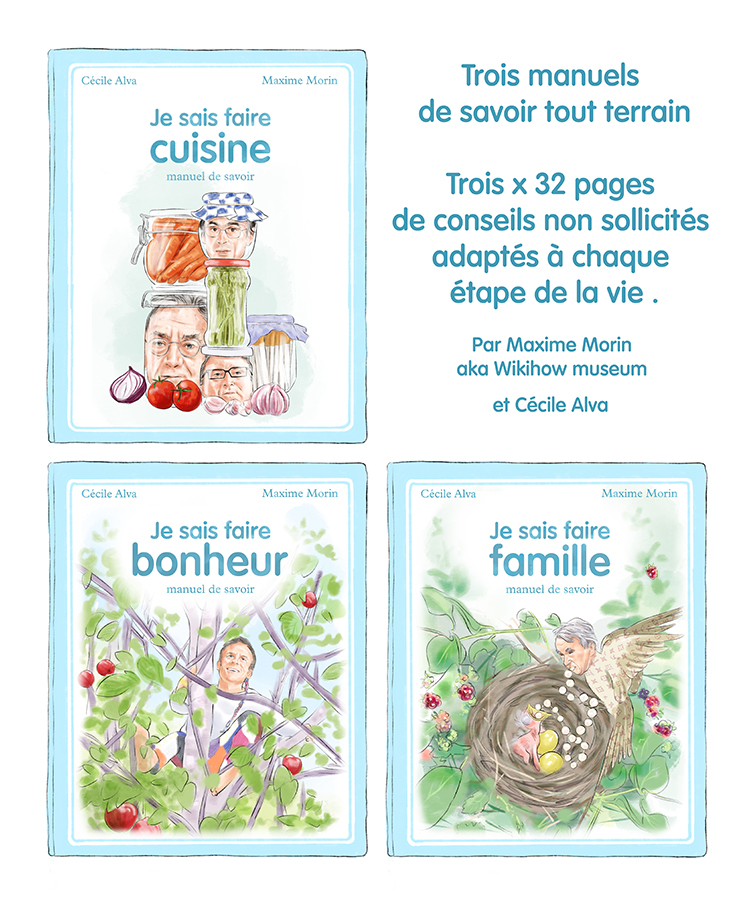 Les manuels Je sais faire, ce sont trois petits livres avec les illustrations de Cécile Alva et les textes de Maxime Morin aka Wikihow museum, librement inspirés des « Martine » et des pires manuels de savoir vivre d’hier et d’aujourd’hui.